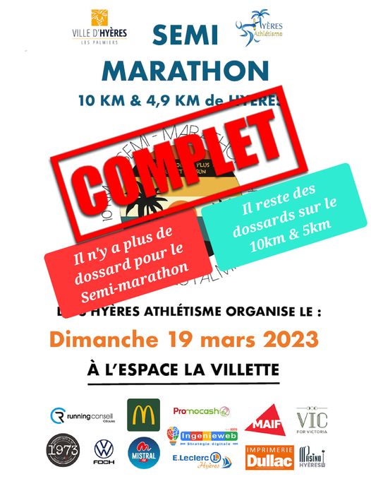 COMPLET Nous vous informons qu’Il n’y a plus de dossard disponible pour s’inscrire sur le semi-marathon de Hyères du 19 Mars 2023 Il reste des dossards sur le 10km…
